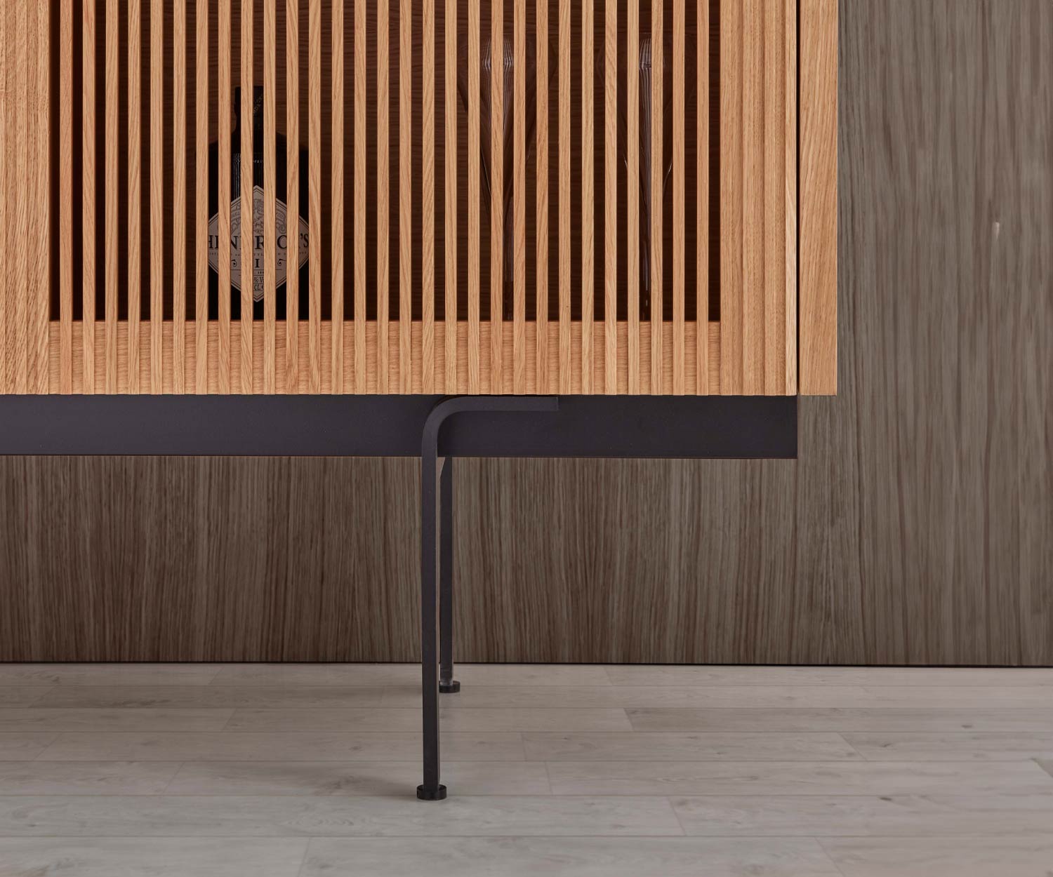 Der innere und äußere Bereich des Punt Highboards Stockholm besteht aus MDF-Platten E1 und Spanplatte E1. Diese sind mit Furnier in Eiche oder Nussbaum veredelt und präsentieren ein beschichtetes, durchlaufendes Furnierbild. Beim Finish der Abdeckplatte handelt es sich um anodisiertes Aluminium. Die rechte Tür ist wie erwähnt mit Eichen oder Walnuss Furnier veredelt, aber die verwendeten Lamellen sind aus Massivholz Eiche oder Walnuss. Der Korpus ruht auf einem Stahlsockel mit pulverbeschichteten Standfüßen.