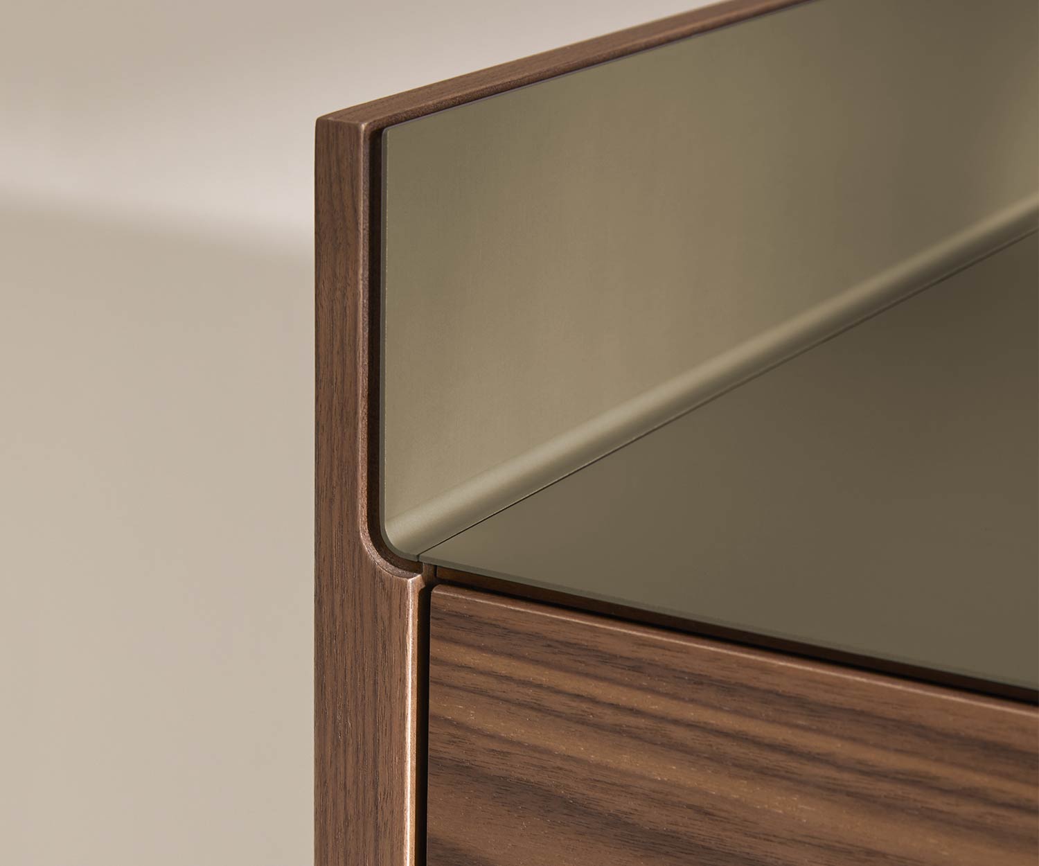 Die Abdeckplatte ist in den Farben Aluminium Gold und Aluminium Bronze erhältlich, Korpus und Front dagegen in Super Matt Eiche, Super Matt Walnuss oder Dunkel gebeizter Eiche (Stained Oak Ebony). Den Stahlsockel gibt es in der Farbe Schwarz RAL9005.