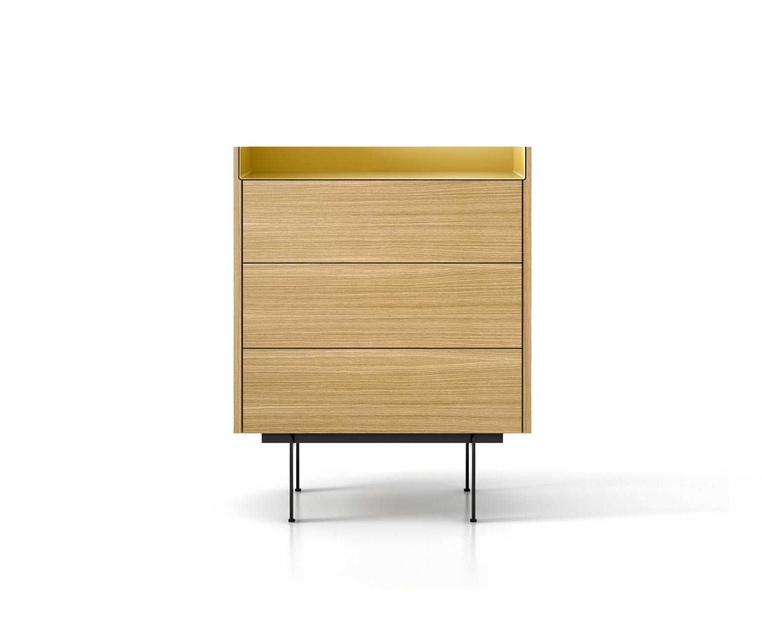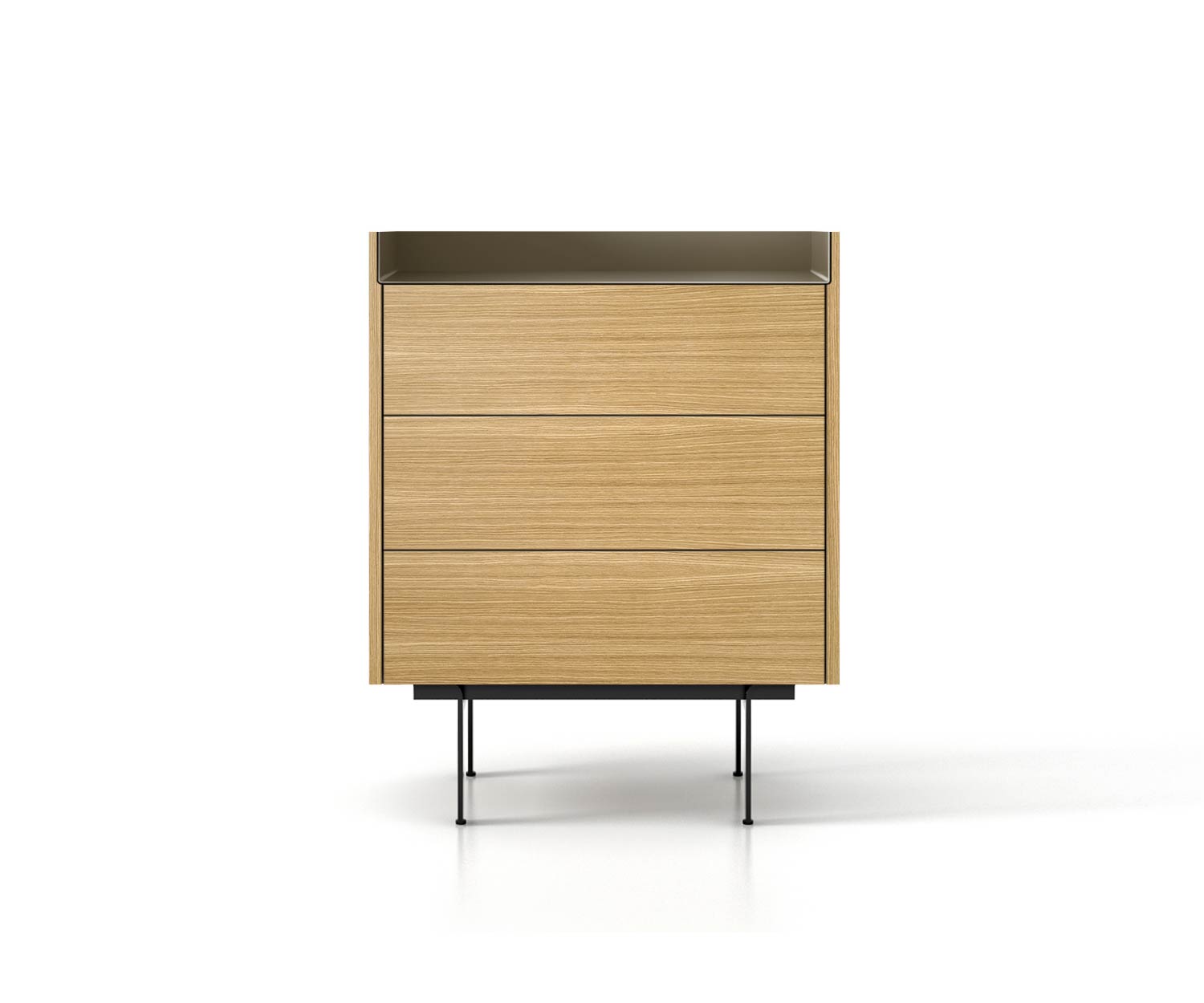 Der Korpus und die Schubladen dieser Design Hochkommode von Punt sind aus MDF-Platten E1 und Spanplatten E1, die mit Eichen- oder Walnuss-Furnier veredelt sind. Es handelt sich dabei um Super Matt Eiche, Super Matt Walnuss oder Dunkel gebeizter Eiche. Das Abdeckplatte on top besteht aus einem hochwertigen anodisierten Aluminium Finish. Der Korpus steht auf einem Stahlsockel mit pulverbeschichteten Füßen.