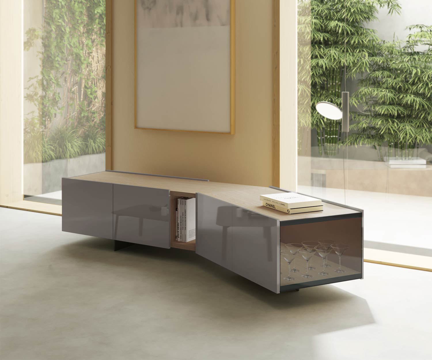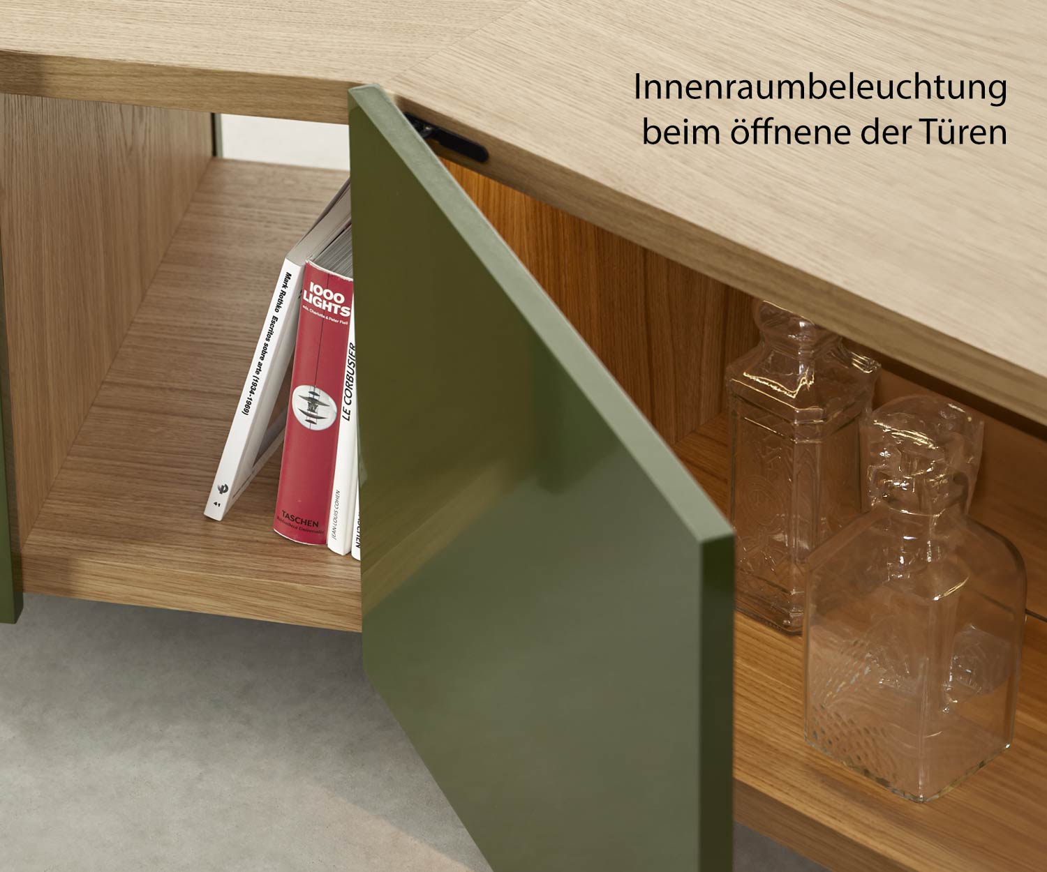 Als Sideboard für die Ecke konzipiert, bietet es grifflose Türen, die sich sich im Winkel von 90 Grad öffnen lassen. Die höhenverstellbaren Standfüße ermöglichen eine flexible Anpassung an jeden Boden. Eine LED Innenraumbeleuchtung (2.700 K) schaltet sich beim Öffnen der Türen ein und beim Schließen wieder aus.