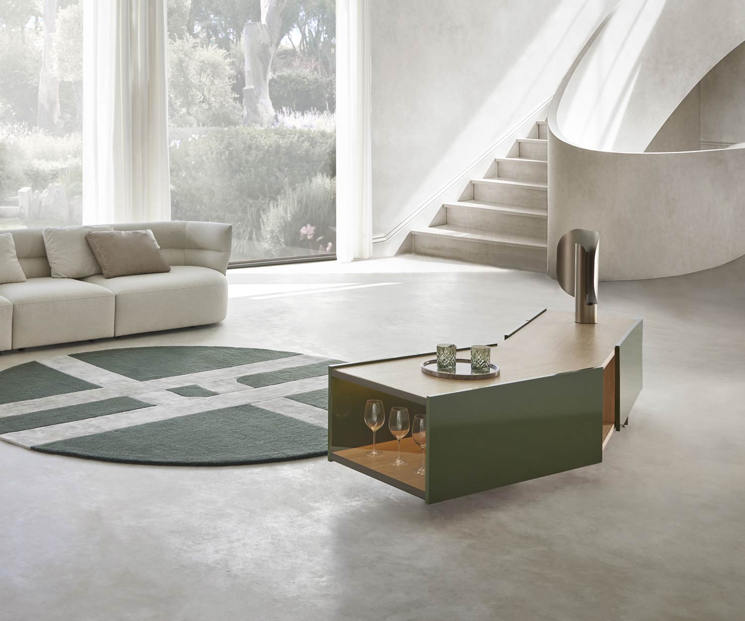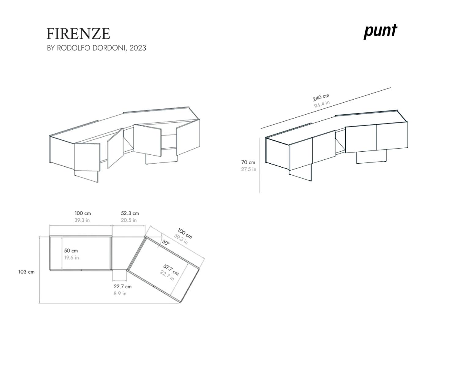 Das Besondere beim Punt Toscana Firenze Sideboard ist sein Knick in einem stumpfen Winkel. Dadurch lässt dieses Design das Möbel immer in den Raum hineinragen und bringt es vom klassischen Wandplatz näher an das Zentrum mit Esstisch und Stühlen.